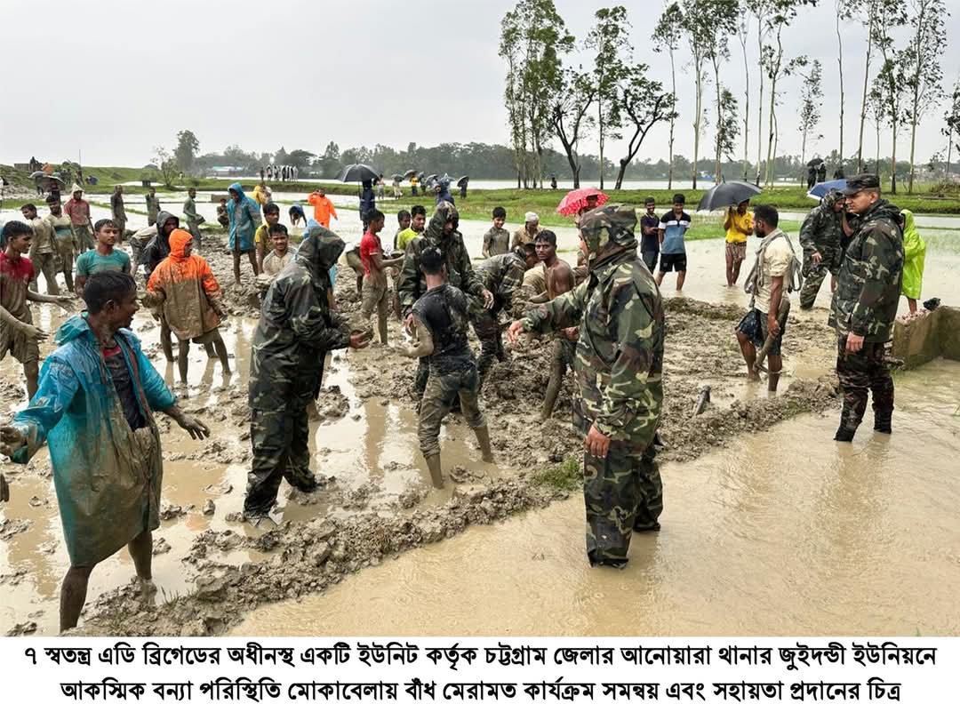 সেনাবাহিনী ক্যাম্প সূত্র বলছে, যেকোনো মানবিক সহায়তায় জনগণের পাশে থাকতে বাংলাদেশ সেনাবাহিনী প্রতিশ্রুতিবদ্ধ। সে অনুযায়ী গতকাল ক্ষতিগ্রস্ত বেড়িবাঁধ মেরামত করা হয়।