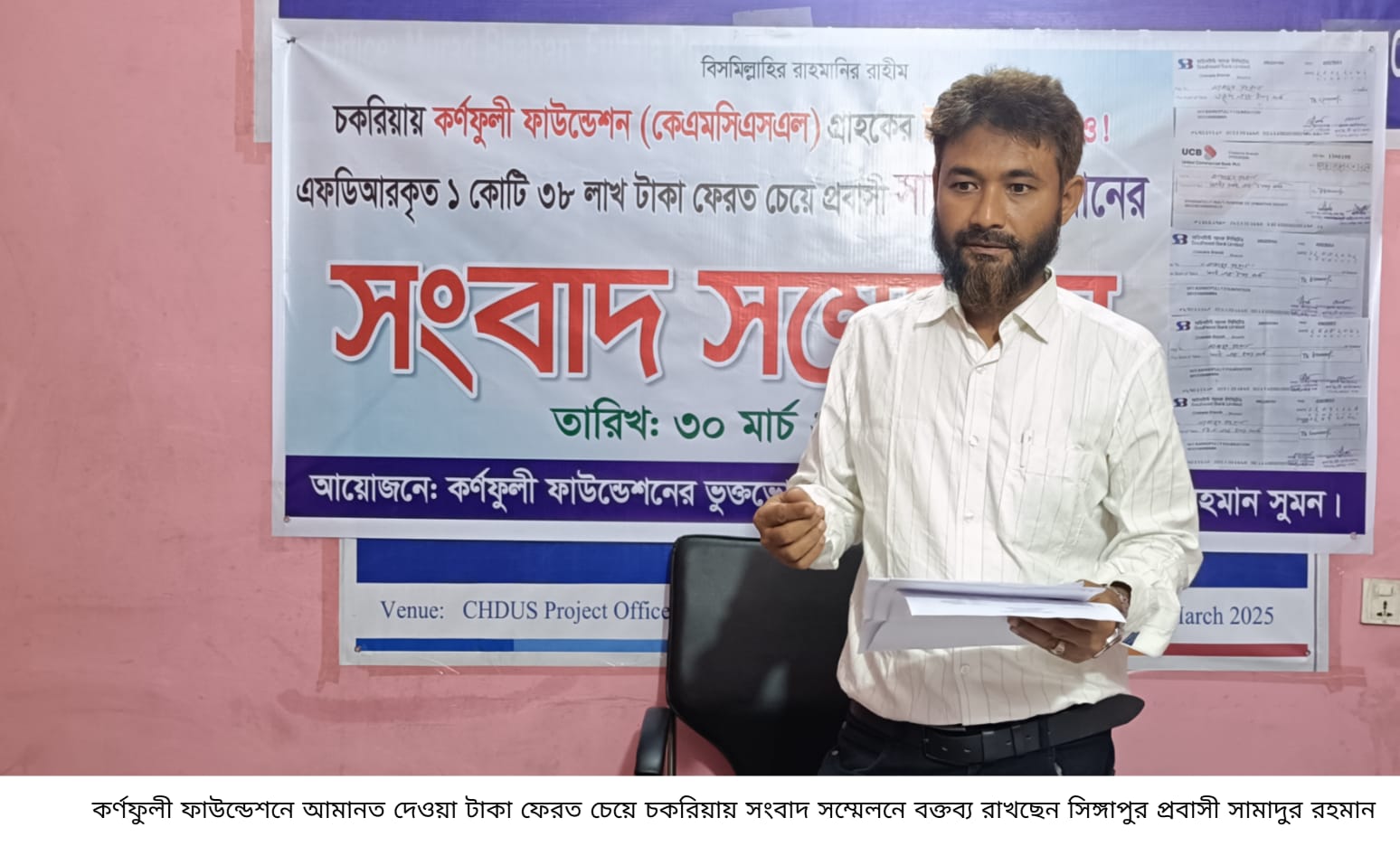 সংবাদ সম্মেলনে লিখিত বক্তব্যে সিঙ্গাপুর প্রবাসী ইঞ্জিনিয়ার সুমন বলেন, দীর্ঘ ১৮ বছর ধরে আমি প্রবাসে রয়েছি। আমার প্রবাস জীবনের কষ্টার্জিত তিলেতিলে সঞ্চয় করা ১ কোটি ৩৮ লক্ষ টাকা ৫ দফায় চকরিয়ার কর্ণফুলী ফাউন্ডেশন (কেএমসিএসএল) এ ফিক্সড ডিপোজিট (এফডিআর) করি। কোম্পানি টি আমাকে তাদের নিজেদের নামীয় ইউনাইটেড কমার্শিয়াল ব্যাংক ও সাউথইস্ট ব্যাংকের নামে ভিন্ন ভিন্ন তারিখের ৫টি চেক প্রদান করে। যার মধ্যে ৩ লাখ টাকার একটি চেক বিগত ২০২৪ সালের ডিসেম্বর মাসে মেয়াদ উত্তীর্ণ হয়ে যায়।