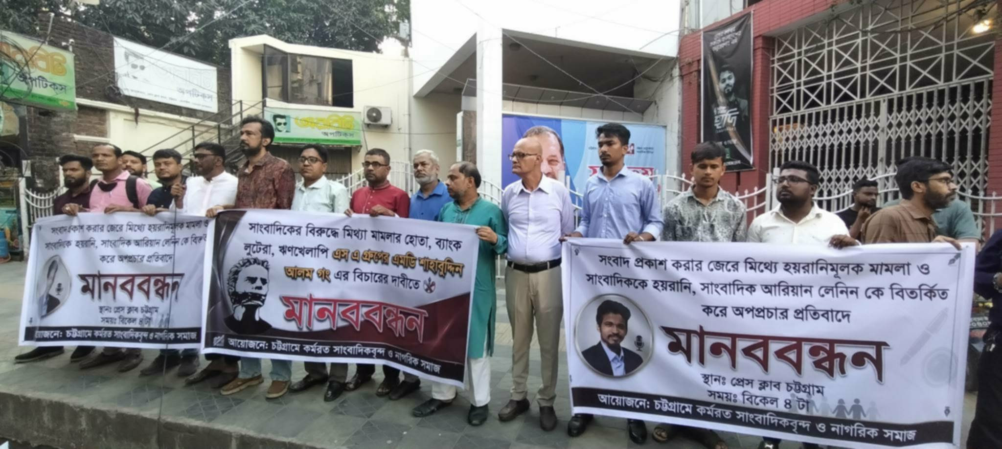 সাংবাদিক আরিয়ান লেলিনের বিরুদ্ধে মিথ্যা মামলার প্রতিবাদে চট্টগ্রামে কর্মরত সাংবাদিকদের মানববন্ধন প্রতিবাদ সমাবেশ অনুষ্ঠিত।