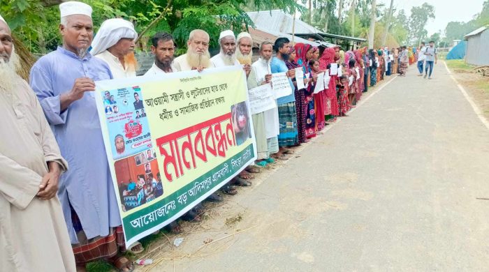 নাটোরের সিংড়ায় ধর্মীয় ও সামাজিক প্রতিষ্ঠান রক্ষায় মানববন্ধন করেছে বড় আদিমপুর গ্রামবাসি। বুধবার সকাল ১১ টায় ( ২৮ মে) উপজেলার ডাহিয়া ইউনিয়ন এর বড়আদিমপুর গ্রামে ২ শতাধিক নারী পুরুষের অংশগ্রহণে